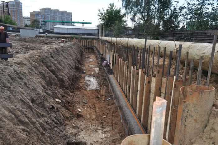 В большинстве случаев требуется временное ограждение траншеи – после прокладки коммуникаций/труб его можно убрать. Исключение составляют фундаменты: здесь ограничительная стенка может быть и временной, и постоянной. В качестве постоянной обычно используются железобетонные шпунты или подпорные стенки из буросекущих свай – по окончании строительства они становятся составной частью фундамента.